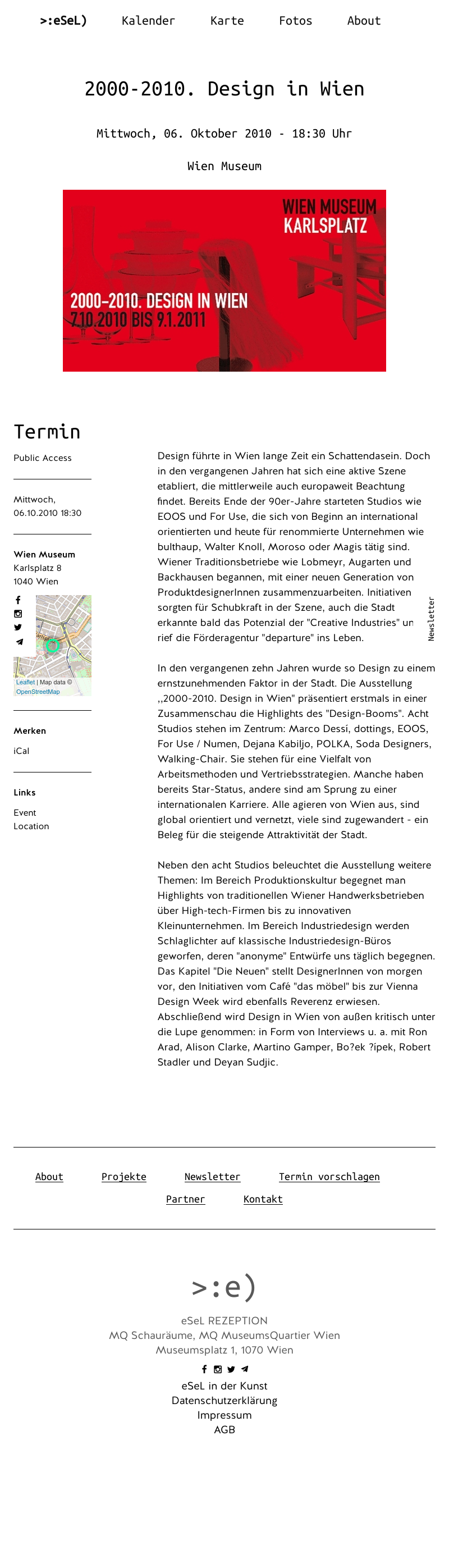 In den vergangenen zehn Jahren wurde so Design zu einem ernstzunehmenden Faktor in der Stadt. Die Ausstellung ,,2000-2010. Design in Wien” präsentiert erstmals in einer Zusammenschau die Highlights des “Design-Booms”. Acht Studios stehen im Zentrum: Marco Dessí, dottings, EOOS, For Use / Numen, Dejana Kabiljo, POLKA, Soda Designers, Walking-Chair. Sie stehen für eine Vielfalt von Arbeitsmethoden und Vertriebsstrategien. Manche haben bereits Star-Status, andere sind am Sprung zu einer internationalen Karriere. Alle agieren von Wien aus, sind global orientiert und vernetzt, viele sind zugewandert - ein Beleg für die steigende Attraktivität der Stadt.