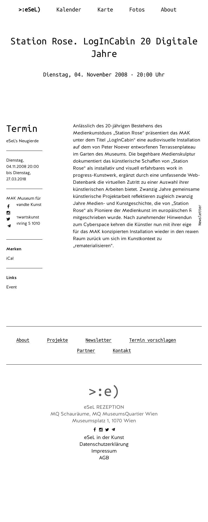 eSeL ist ein Informationsportal für Kunst und Kultur. Hier findest du empfohlene Veranstaltungen, Ausstellungen, Museen, Kinoprogramm, Theater, Performances und mehr in Wien und ganz Österreich.